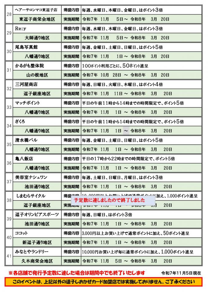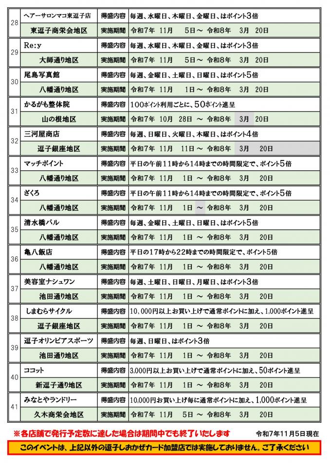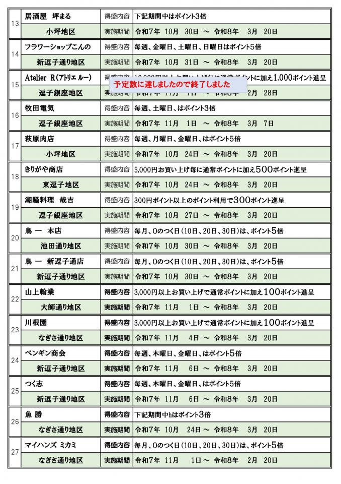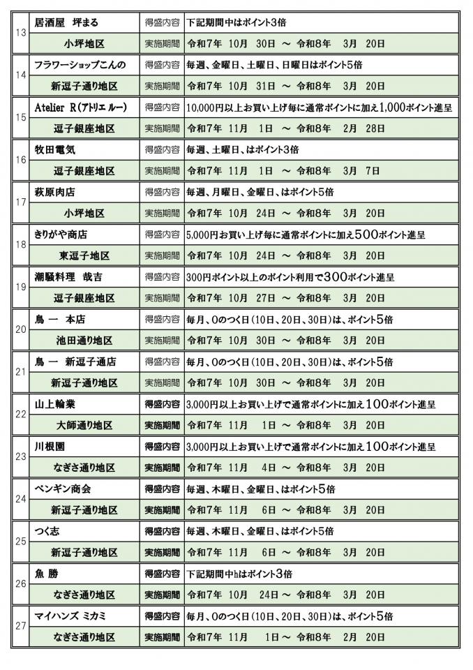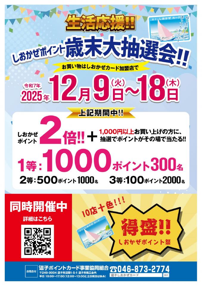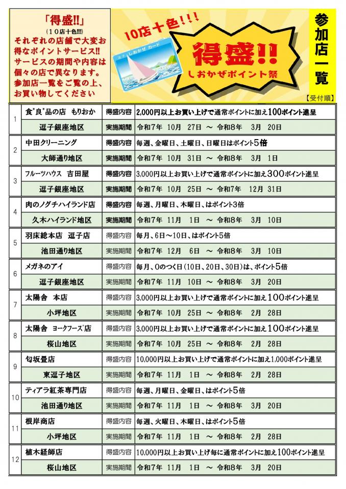 10店十色「得盛」サービスのご案内ただいま逗子しおかぜカード加盟店の約半数の41店舗でポイントがたくさんもらえる「得盛」しおかぜポイント祭りを実施中!!実施店舗名とポイントがたくさんもらえる内容は下記一覧をご覧ください。